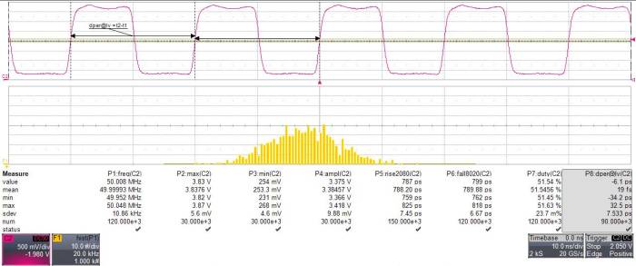 下面是在LecroyWaverunner610ZI數字示波器上測量50MHzXO的周期間抖動示例.在這種情況下,分配給P8并標記為“dper”的抖動測量工具用于計算周期間抖動.該分析儀平臺設置為一次測量30,000個樣品,并執行三次以獲得平均峰-峰值.