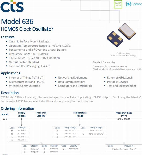 CTS公司(紐約證券交易所代碼:CTS)正利用這一情況為契機,更新我們的小型封裝XO組合,以適應2022年第一季度初產量恢復后的性能參數。隨著現有型號的更新,我們宣布發布四種新型號636。這些通用XO晶體振蕩器設計的修訂組合;提供具有優秀相位噪聲和高穩定性性能屬性的頻率參考,將支持多種通信協議。