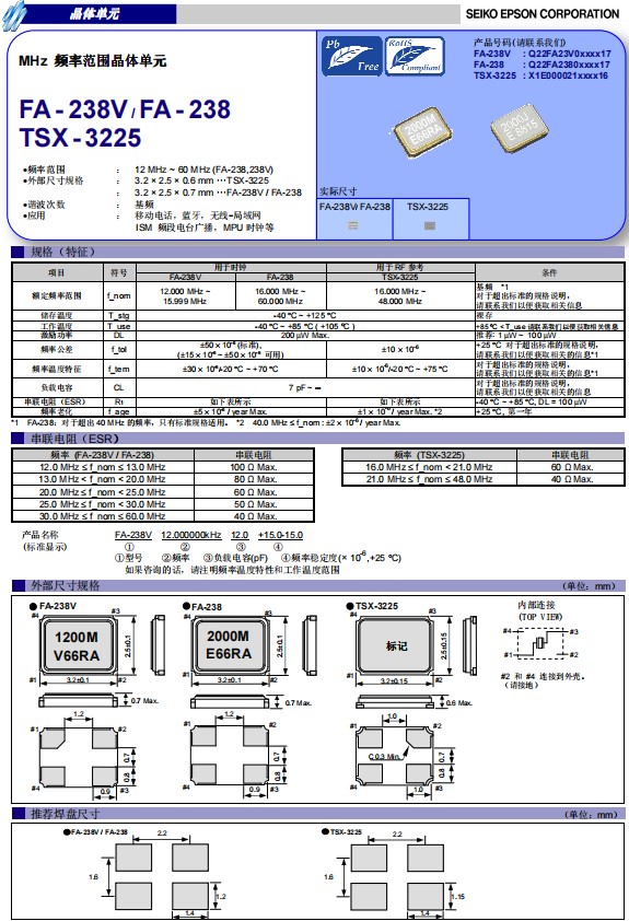 日本愛普生晶振TSX-3225是一款小體積3.2x2.5mm無源晶振,石英晶體諧振器,四腳貼片晶振,頻率范圍16MHz至48MHz,工作溫度范圍-40℃至+85℃(+105℃),具有小體積輕薄型,耐熱及耐環境特性,穩定性極好,非常適用于小型便捷式設備,可穿戴設備,汽車電子,消費電子,無線藍牙,智能手機,平板電腦,數碼電子等。