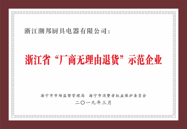 潮邦集成灶榮獲浙江省 “廠商無理由退貨” 示范企業