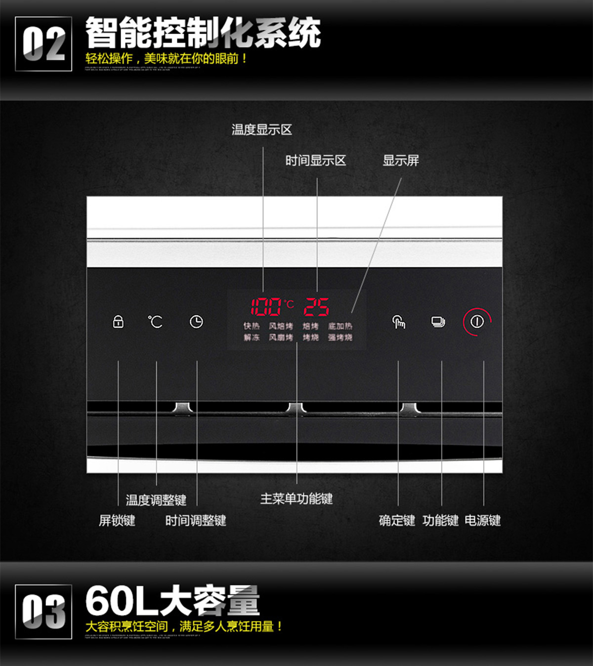 60L大容量;內置全自動精確控溫探頭;立體循環熱風;高溫搪瓷內膽;